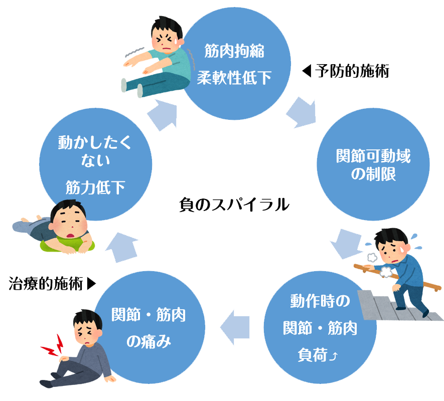 筋肉が硬く拘縮する(柔軟性が低下する)と日常生活動作やスポーツなどで、関節や筋肉の痛み、 骨格の歪みなどの症状が起こりやすくなります。 また怪我なども長期間放置すると、回復に時間がかかりますので、施術は早期に受けていただくようお願いしております。